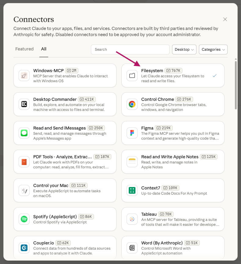 Still in Settings, scroll down to the Desktop app section in the left sidebar, then click Extensions, then Browse Extensions. Find and install the Filesystem Extension. This is what allows Claude to actually read and write files on your machine.